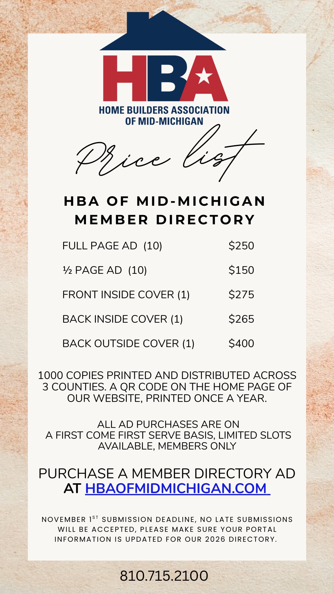 All members will have their business and contact information included on the directory pages. (please reach out to Christy at INFO@HBAOFMIDMICHIGAN.COM if your portal information is not updated. Incomplete or outdated information is the members responsibility.)